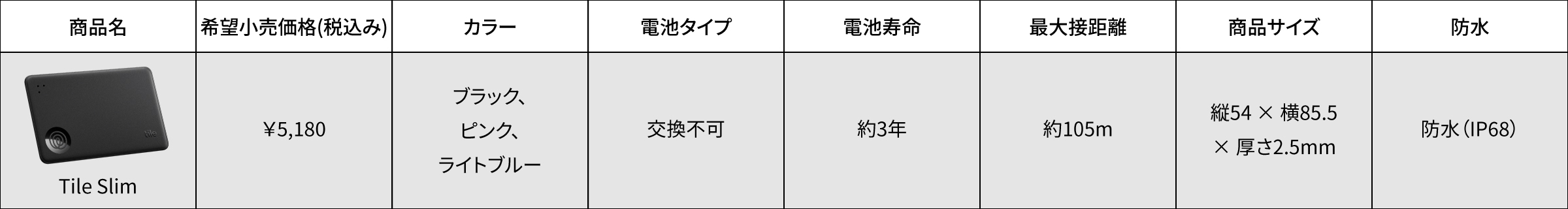 「Tile Slim(2024)」は、カードサイズのデザインで財布やパスポートホルダー、荷物などに簡単に入れられる、「Tile」シリーズで最も薄型のモデルです。今回、従来の「ブラック」に加えて新たに「ピンク」と「ライトブルー」の2色が加わり、シーンに合わせてよりファッショナブルに身につけられようになりました。